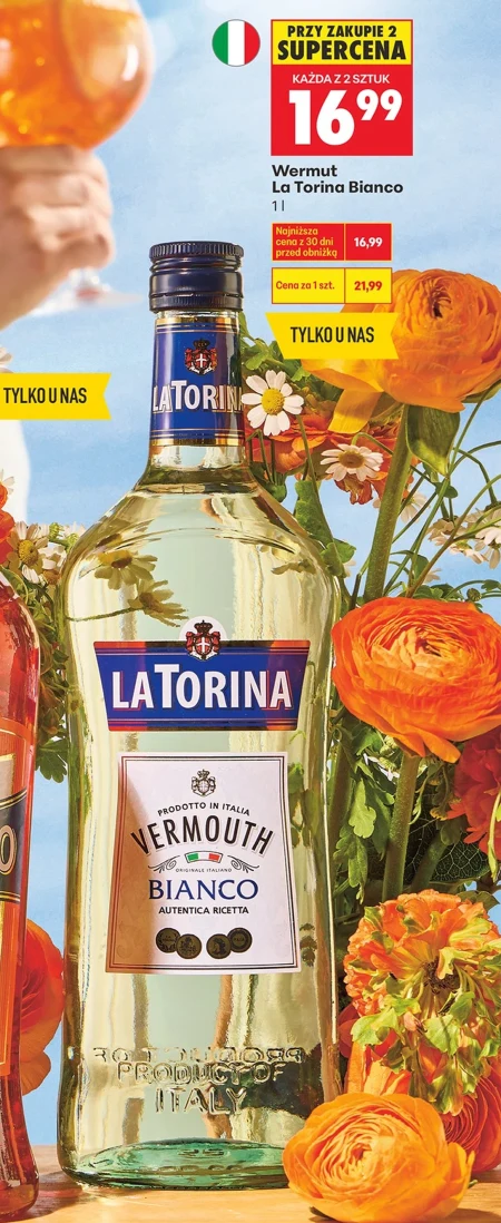 Wermut La Torina Bianco 1 l występuje w ofercie Biedronka w cenie 21,99 zł za sztukę. Przy zakupie dwóch butelek cena każdej spada do 16,99 zł. Wermut to klasyczny aperitif, idealny do picia na aperitif przed posiłkiem lub jako składnik koktajli. Najniższa cena z ostatnich 30 dni wynosiła 16,99 zł, co sprawia, że obecna oferta jest wyjątkowo atrakcyjna. Skorzystaj z promocyjnej ceny i zaopatrz się w ulubiony wermut. Oferta ważna od 2026-04-07 do 2026-04-18 Źródło: gazetka Biedronka