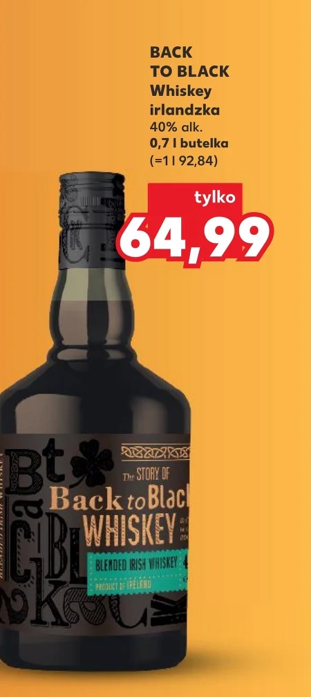Whiskey irlandzka Back to Black dostępna jest w ofercie Kaufland w butelce o pojemności 0,7 litra w cenie 64,99. Produkt charakteryzuje się 40% zawartością alkoholu i stanowi doskonały wybór dla miłośników tego trunku. To klasyczna propozycja idealna do degustacji w czystej postaci lub jako składnik wyrafinowanych drinków. Skorzystaj z okazji i spróbuj wyjątkowego smaku prawdziwej irlandzkiej whiskey.