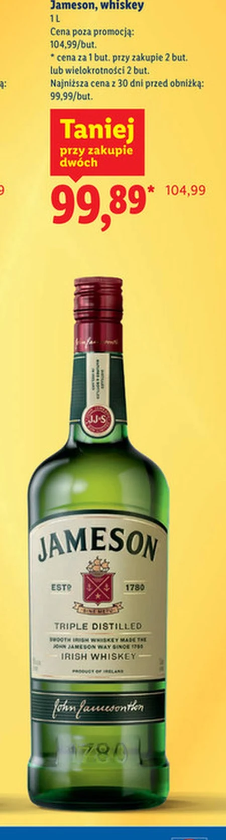 Jameson whiskey 1L dostępny jest w Lidlu w cenie 99,89 zł za butelkę przy zakupie dwóch lub wielokrotności dwóch butelek, co stanowi obniżkę z 104,99 zł. Promocja w Lidlu pozwala zaoszczędzić, a cena jest najniższa od 30 dni. Whiskey Jameson idealnie sprawdzi się jako klasyczny drink lub dodatek do specjalnych okazji. Sprawdź najnowszą gazetkę Lidl, aby potwierdzić dostępność i warunki promocji.