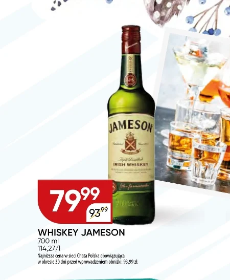 Whiskey Jameson w butelce o pojemności 700 ml dostępny jest w ofercie Chata Polska w cenie 79,99 zł, co stanowi obniżkę z 93,99 zł, a cena za litr wynosi 114,27 zł. Ten klasyczny irlandzki trunek jest idealny do picia na czysto z lodem, jak i jako baza do wielu popularnych drinków. Doskonale sprawdzi się podczas spotkań z przyjaciółmi lub jako dodatek do wyjątkowych chwil, zachęcając do delektowania się smakiem bogatej tradycji. Teraz możesz skosztować wysokiej jakości whiskey w atrakcyjnej cenie.