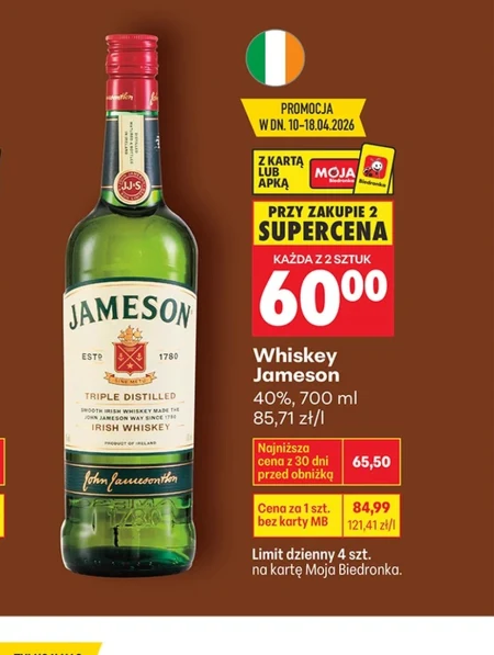 Whiskey o pojemności 700 ml, w cenie 85,71 zł za litr, występuje w ofercie Biedronka. Przy zakupie dwóch butelek z kartą Moja Biedronka lub aplikacją, cena za każdą sztukę spada do 60,00 zł. Tradycyjnie, bez karty cena za jedną butelkę to 84,99 zł, czyli 121,41 zł za litr. To klasyczny trunek, idealny do picia solo z lodem, jak również jako baza do wielu popularnych drinków. Produkt ten oferuje 40% zawartości alkoholu. Promocja obowiązuje w dniach 10-18 kwietnia 2026 roku, z limitem dziennym 4 sztuk na jedną kartę Moja Biedronka. Warto skorzystać z tej okazji, ponieważ najniższa cena w ciągu ostatnich 30 dni przed obniżką wynosiła 65,50 zł. Oferta ważna od 2026-04-07 do 2026-04-18 Źródło: gazetka Biedronka