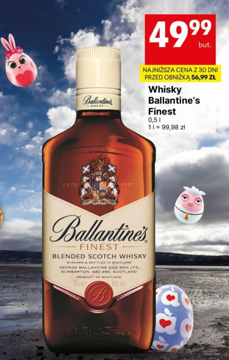 Ballantine's Finest 0,5 l w Delikatesy Centrum kupisz teraz za 49,99 zł – to najniższa cena w ciągu ostatnich 30 dni. Regularnie kosztująca 56,99 zł whisky dostępna jest w obniżonej cenie, co oznacza, że litr tego trunku wyjdzie Ci na 99,98 zł. Idealnie sprawdzi się jako podstawa klasycznych drinków lub do delektowania się w czystej postaci.
