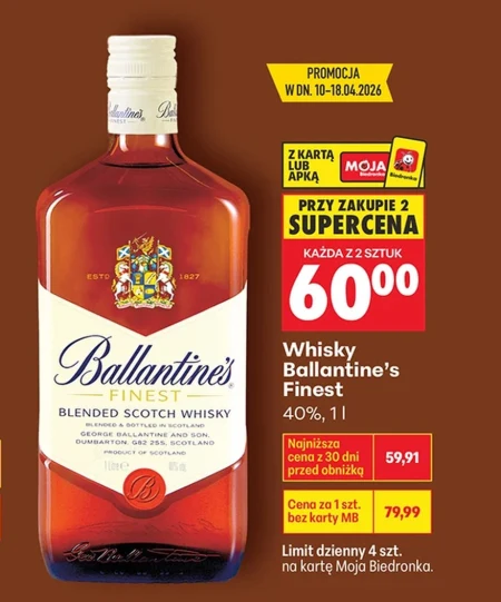 Whisky Ballantine's Finest, o pojemności 1 litra i zawartości alkoholu 40%, jest dostępne w ofercie Biedronka w cenie 79,99 zł za butelkę bez karty Moja Biedronka. W okresie od 10 do 18 kwietnia 2026 roku, przy zakupie dwóch butelek z kartą lub aplikacją Moja Biedronka, cena za każdą sztukę wyniesie jedynie 60,00 zł. Whisky to klasyczny trunek, idealny do degustacji w czystej formie, jako składnik koktajli lub uzupełnienie wyjątkowych okazji. Limit dziennego zakupu to 4 sztuki na jedną kartę Moja Biedronka, co pozwala zaopatrzyć się na dłużej lub podzielić się smakiem z bliskimi. Oferta ważna od 2026-04-07 do 2026-04-18 Źródło: gazetka Biedronka