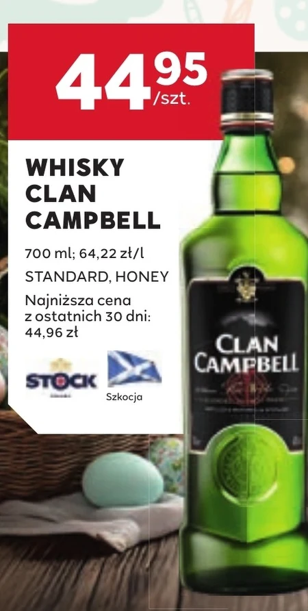 Whisky Clan Campbell w Stokrotce dostępna jest w cenie 44,95 zł za butelkę o pojemności 700 ml, co daje 64,22 zł za litr. To okazja, ponieważ jest to najniższa cena tego produktu w ostatnich 30 dniach – wcześniej kosztowała 44,96 zł. Whisky Clan Campbell Standard Honey idealnie sprawdzi się jako baza do drinków lub do delektowania się smakiem w czystej postaci. W Stokrotce możesz zaoszczędzić, kupując whisky w promocyjnej cenie.