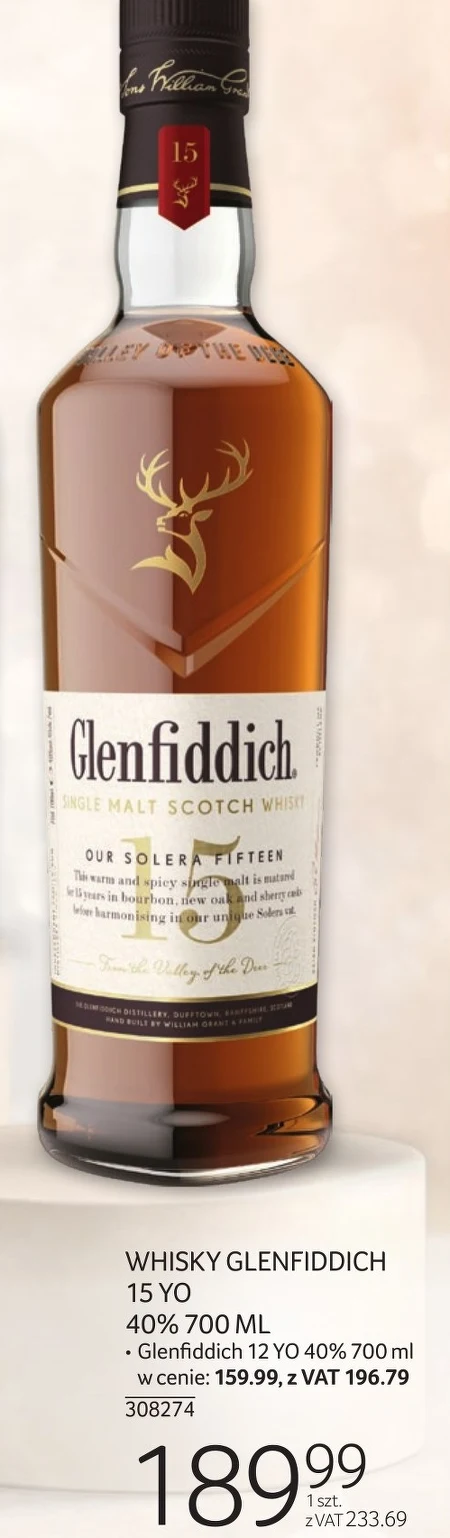 Whisky Glenfiddich 15 YO o pojemności 700 ml jest dostępne w Selgros Cash&Carry w cenie 189.99 zł z VAT, co daje 233.69 zł. Trzynastoletnia, dojrzewająca w beczkach po sherry i bourbonie, whisky oferuje bogaty smak owoców, przypraw i delikatnej nuty dymu. To idealny wybór dla koneserów szukających wyrafinowanego trunku o charakterystycznym aromacie i długim finiszu. Warto skorzystać z tej okazji i spróbować wyjątkowego smaku Glenfiddich.