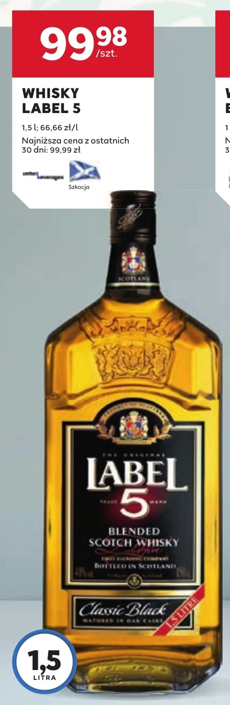 Whisky Label 5 w Stokrotce kosztuje teraz 99,98 zł za butelkę o pojemności 1,5 litra, co daje 66,66 zł za litr. To obniżka względem najniższej ceny z ostatnich 30 dni, wynoszącej 95,99 zł. Idealnie sprawdzi się do przygotowania klasycznych drinków lub delektowania się smakiem w czystej postaci, a aktualna cena w Stokrotce to okazja dla miłośników whisky. Sprawdź gazetkę Stokrotka i zaoszczędź na swoim ulubionym trunku.