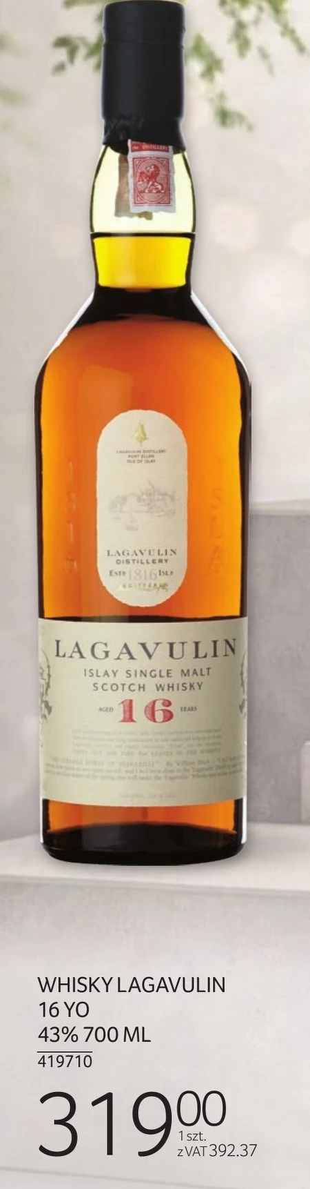 Whisky Lagavulin 16 Years Old w butelce o pojemności 700 ml dostępna jest w Selgros Cash&Carry w cenie 319,00 zł. To szkocka whisky single malt o mocy 43%, znana ze swojego bogatego, torfowego aromatu i smaku. Lagavulin 16 YO to propozycja dla koneserów, idealna do degustacji solo lub z dodatkiem kostki lodu. Wyjątkowy charakter tej whisky sprawia, że stanowi doskonały prezent dla miłośników wysokiej jakości alkoholi.
