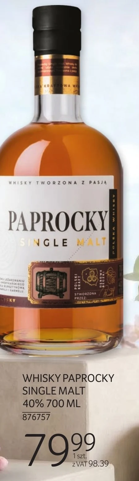 Whisky Paprocky Single Malt o pojemności 700 ml jest dostępny w Selgros Cash&Carry w cenie 79,99 zł z VAT, co daje 98,39 zł. To klasyczna propozycja dla miłośników whisky, charakteryzująca się gładkim smakiem i aromatem, zawartością alkoholu 40%. Whisky Single Malt idealnie sprawdzi się zarówno podczas specjalnych okazji, jak i w chwilach relaksu. Warto skorzystać z tej oferty, aby spróbować wyjątkowego trunku.