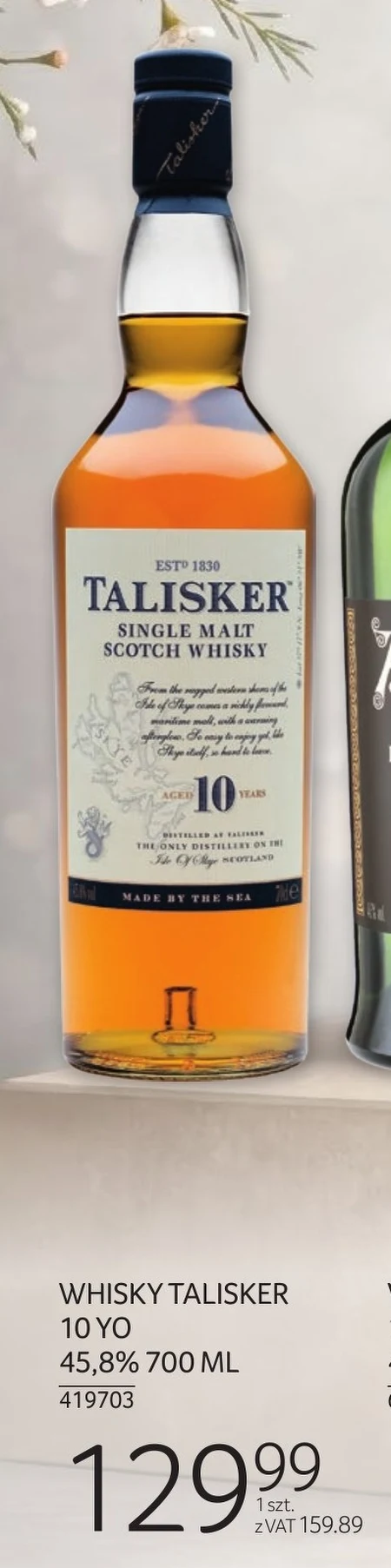 W Selgros Cash&Carry można kupić whisky Talisker 10 YO o pojemności 700 ml w cenie 129,99 zł. Produkt ma zawartość alkoholu 45,8%. To single malt scotch whisky, charakteryzująca się dymnym aromatem z nutami owoców morskich i pieprzu, idealna do degustacji w czystej postaci lub jako element drinków. To doskonała okazja, by spróbować wyjątkowej szkockiej whisky.