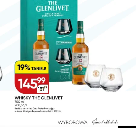 Whisky The Glenlivet, dostępne w Chata Polska, możesz nabyć już za 145,99 zł za butelkę o pojemności 700 ml, co stanowi 19% zniżki względem ceny 181,99 zł obowiązującej w ostatnim miesiącu. To klasyczny single malt, idealny zarówno do degustacji w czystej formie, jak i jako baza do wyrafinowanych koktajli. Whisky The Glenlivet to propozycja dla tych, którzy cenią sobie bogaty aromat i delikatny smak, stanowiący kwintesencję szkockiego rzemiosła. Warto skorzystać z tej okazji, by spróbować jednego z najbardziej rozpoznawalnych trunków na świecie w atrakcyjnej cenie.
