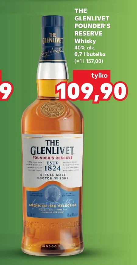 The Glenlivet Founder’s Reserve whisky jest dostępna w ofercie Kaufland w cenie 109,90 za butelkę o pojemności 0,7 litra, co odpowiada cenie 157,00 za litr. To klasyczna szkocka whisky o mocy 40%, idealna do degustacji w czystej postaci lub jako baza do koktajli. Jej bogaty, owocowy smak i delikatny aromat sprawią, że będzie doskonałym towarzyszem wyjątkowych chwil. To wyjątkowa okazja, aby spróbować renomowanej whisky w atrakcyjnej cenie.