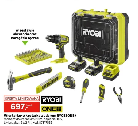 Wiertarko-wkrętarka z udarem RYOBI ONE+ moment dokręcania: 52 Nm, napięcie: 18 V, Li-Ion, aku.: 2 x 2 Ah, kod: 87147535