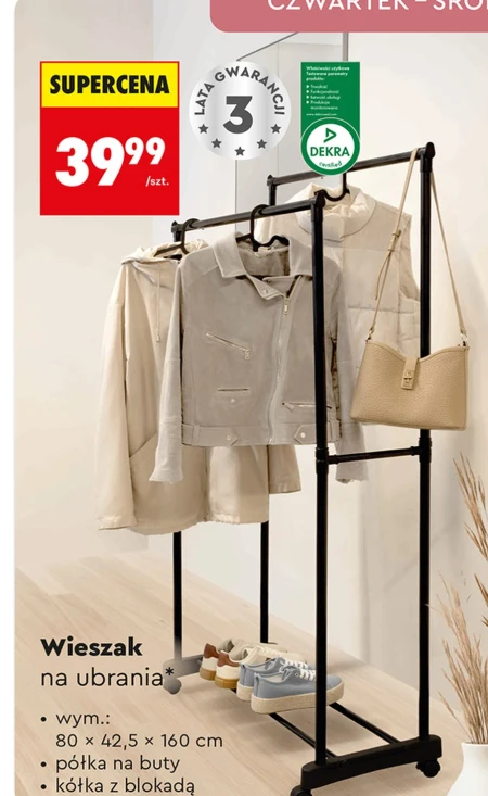 Wieszak na ubrania jest dostępny w ofercie Biedronka w cenie 39,99 zł za sztukę. To praktyczne rozwiązanie do przechowywania odzieży, które pozwoli uporządkować przestrzeń w sypialni lub garderobie. Wieszak ma wymiary 80 x 42,5 x 160 cm i posiada dodatkową półkę na buty oraz kółka z blokadą, dzięki czemu można go łatwo przesuwać i stabilnie ustawić. To okazja, by za niewielkie pieniądze zyskać funkcjonalny mebel, który ułatwi codzienne życie. Oferta ważna od 2026-04-11 do 2026-04-29 Źródło: gazetka Biedronka