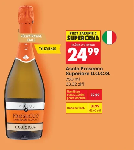 Asolo Prosecco Superiore D.O.C.G. dostępne jest w ofercie Biedronki w cenie 31,99 zł za butelkę 750 ml, co daje 33,32 zł za litr. Obecnie, przy zakupie dwóch butelek, każda kosztuje 24,99 zł. To włoskie wino musujące, idealne na specjalne okazje lub jako dodatek do wyjątkowych chwil. Najniższa cena tego produktu w ciągu ostatnich 30 dni wynosiła 22,99 zł, więc teraz jest to okazja do zaopatrzenia się w wyjątkowe Prosecco w korzystnej cenie. Oferta ważna od 2026-04-07 do 2026-04-18 Źródło: gazetka Biedronka