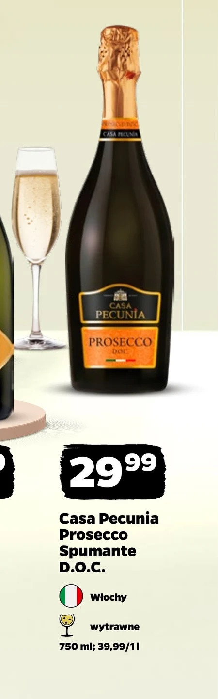 Casa Pecunia Prosecco Spumante D.O.C. dostępne jest w ofercie Netto w cenie 29,99 za butelkę 750 ml, co daje 39,99 za litr. To włoskie wino musujące o wytrawnym smaku, idealne na specjalne okazje, ale również jako dodatek do lekkich przekąsek i wieczornych spotkań. Prosecco D.O.C. cechuje się delikatnymi bąbelkami i świeżym, owocowym aromatem. Warto skorzystać z tej okazji i spróbować tego wyjątkowego wina prosto z Włoch.