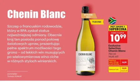 Exclusive Selection Chenin Blanc 750 ml 14,65 zł/l Najniższa cena z 30 dni przed obniżką 14,99 Cena za 1 szt. 19,99 26,65 zł/l Szczep o francuskim rodowodzie, który w RPA zyskał status najważniejszej odmiany. Obecnie kraj ten posiada ponad połowę światowych upraw, prezentując pełne spektrum możliwości tego grona – od lekkich win musujących po wielowymiarowe wina ciche w różnych stylach winiarskich.
