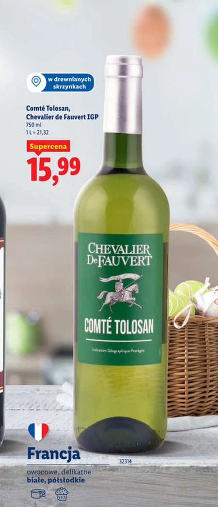 Comté Tolosan Chevalier de Fauvert IGP dostępny jest w Lidlu w cenie 15,99 za butelkę o pojemności 750 ml, co daje 21,32 za litr. W aktualnej gazetce Lidl produkt oznaczony jest jako "Supercena", a jego promocyjna cena to znaczna obniżka w stosunku do standardowej. Idealnie nadaje się do przygotowania serowych fondue lub jako dodatek do dań kuchni francuskiej. Sprawdź dostępność i szczegóły promocji w najnowszej gazetce Lidl.