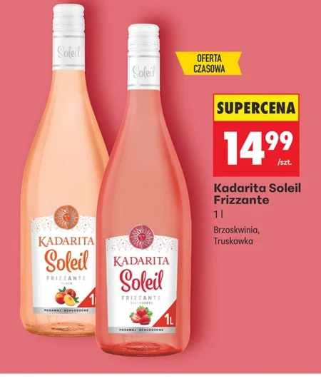 Kadarita Soleil Frizzante występuje w ofercie Biedronka w cenie 14,99 za butelkę o pojemności 1 litra. Napój gazowany dostępny jest w dwóch smakach: brzoskwiniowym i truskawkowym, co pozwoli znaleźć ulubiony aromat. To orzeźwiająca propozycja na upalne dni lub jako dodatek do spotkań ze znajomymi. Warto skorzystać z tej okazji, aby zaopatrzyć się w ulubiony napój w atrakcyjnej cenie. Oferta ważna od 2026-04-07 do 2026-04-18 Źródło: gazetka Biedronka