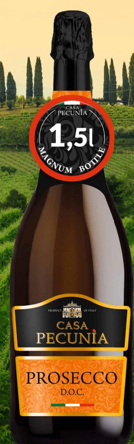 Wino musujące Prosecco Casa Pecunia, pojemność 1,5 l. Białe wytrawne 11%.