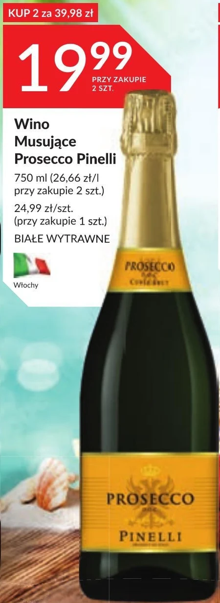 Wino musujące Prosecco Pinelli, pojemność 750 ml. Cena za sztukę przy zakupie dwóch.