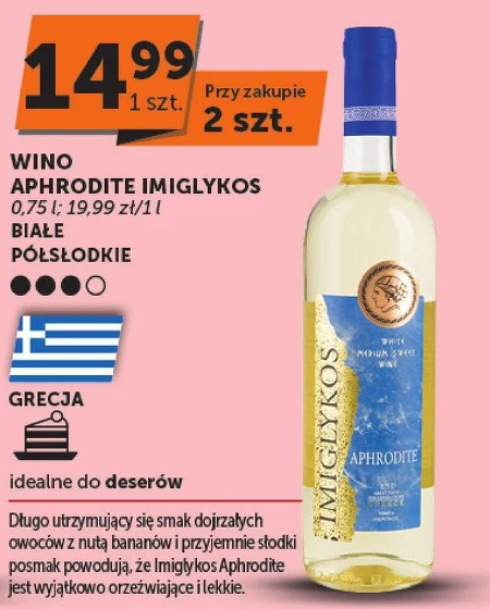 WINO APHRODITE IMIGLYKOS 0,75 l; 19,99 zł/1 l BIAŁE PÓŁSŁODKIE Długo utrzymujący się smak dojrzałych owoców z nutą bananów i przyjemnie słodki posmak powodują, że Imiglykos Aphrodite jest wyjątkowo orzeźwiające i lekkie.