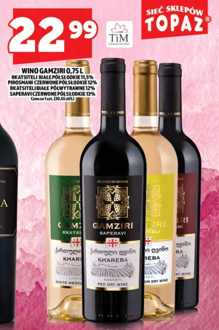 Wino Gamziri o pojemności 0,75 litra dostępne jest w ofercie Topaz w cenie 22,99 zł, co daje 30,65 zł za litr. Oferowane są różne rodzaje wina Gamziri: białe półsłodkie Rkatsiteli, czerwone półsłodkie Pirosmani, białe półwytrawne Rkatsiteli oraz czerwone półsłodkie Saperavi, wszystkie o różnej zawartości alkoholu. Wina te to propozycja dla osób poszukujących ciekawych smaków w przystępnej cenie, idealnych do lekkich posiłków lub jako dodatek do spotkań z przyjaciółmi. Warto skorzystać z tej okazji, aby spróbować różnych odmian wina Gamziri i znaleźć swój ulubiony smak. Oferta ważna od 2026-04-01 do 2026-04-16 Źródło: gazetka Topaz