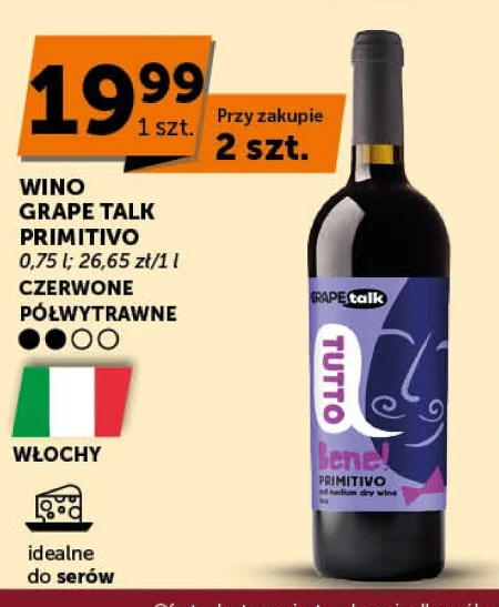 WINO GRAPE TALK PRIMITIVO 0,75 l; 26,65 zł/1 l CZERWONE PÓŁWYTRAWNE