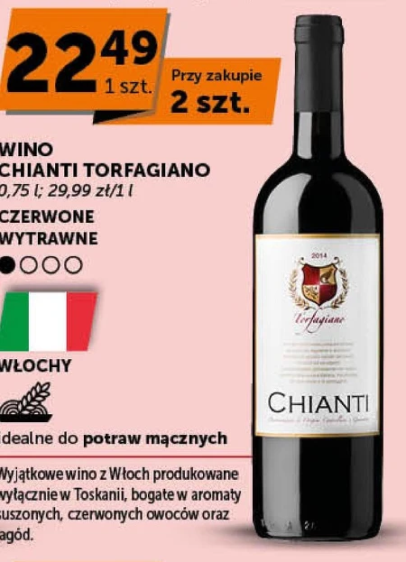 WINO CHIANTI TORFAGIANO 0,75 l; 29,99 zł/1 l CZERWONE WYTRAWNE dealne do potraw mącznych Wyjątkowe wino z Włoch produkowane wyłącznie w Toskanii, bogate w aromaty suszonych, czerwonych owoców oraz jagód.