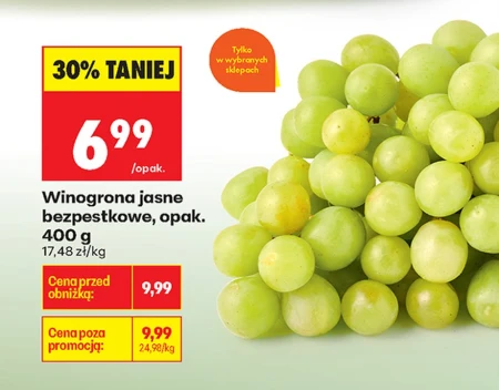 Winogrona jasne bezpestkowe, opak. 400 g 30% TANIEJ 6,99 /opak. 17,48 zł/kg Cena przed obniżką: 9,99 Cena poza promocją: 24,98 zł/kg Soczyste, jasne winogrona bezpestkowe w wygodnym opakowaniu 400 g. Aktualnie dostępne w promocyjnej cenie 6,99 zł zamiast 9,99 zł – warto sprawdzić gazetkę Biedronki, by nie przegapić tej okazji. Idealne jako zdrowa przekąska, dodatek do owocowych sałatek, a także deserów czy śniadań, a w Biedronce teraz wyjątkowo tanie. Zadbaj o witaminy i smak lata z tą ofertą, którą można znaleźć w najnowszej gazetce promocyjnej.
