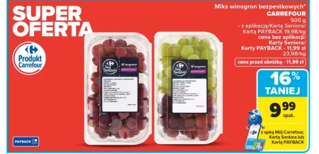 Miks winogron bezpestkowych* CARREFOUR 500 g - z aplikacją/Kartą Seniora/ Kartą PAYBACK 19,98/kg cena bez aplikacji/ Karty Seniora/ Karty PAYBACK - 11,99 zł 23,98/kg cena przed obniżką - 11,99 zł