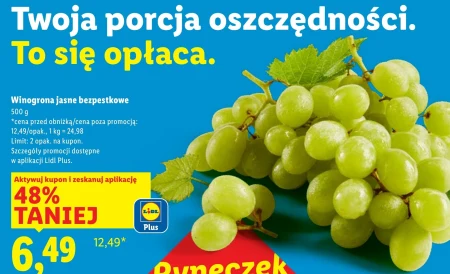 Winogrona jasne bezpestkowe 500 g *cena przed obniżką/cena poza promocją: 12,49/opak., 1 kg - 24,98 Limit: 2 opak. na kupon. Szczegóły promocji dostępne w aplikacji Lidl Plus.