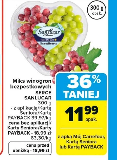 Miks winogron bezpestkowych SERCE SANLUCAR 300 g - z aplikacją/Kartą Seniora/Kartą PAYBACK 39,97/kg cena bez aplikacji/ Karty Seniora/Karty PAYBACK - 18,99 zł 63,30/kg cena przed obniżką - 18,99 zł