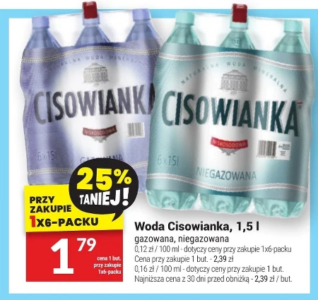 Woda Cisowianka, 1,5 l gazowana, niegazowana 0,12 zł / 100 ml - dotyczy ceny przy zakupie 1x6-packu Cena przy zakupie 1 but. - 2,39 zł 0,16 zł / 100 ml - dotyczy ceny przy zakupie 1 but. Najniższa cena z 30 dni przed obniżką - 2,39 zł / but.