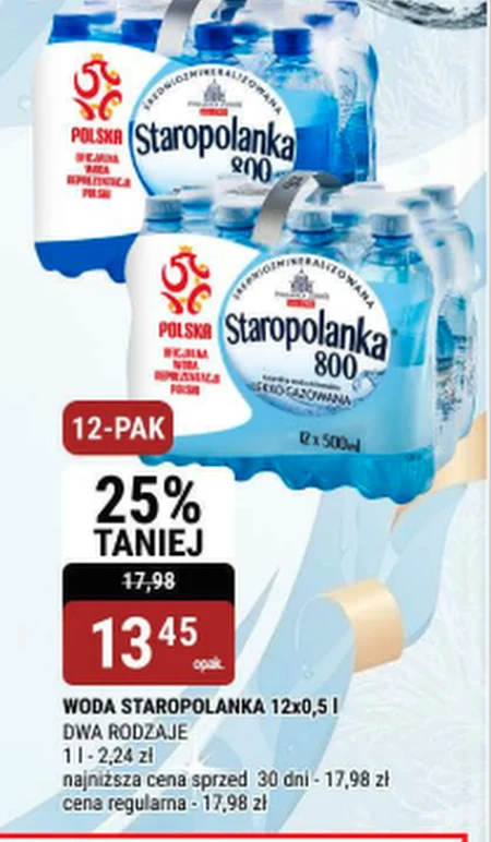 WODA STAROPOLANKA 12x0,5 l DWA RODZAJE 1 l - 2,24 zł najniższa cena sprzed 30 dni - 17,98 zł cena regularna - 17,98 zł