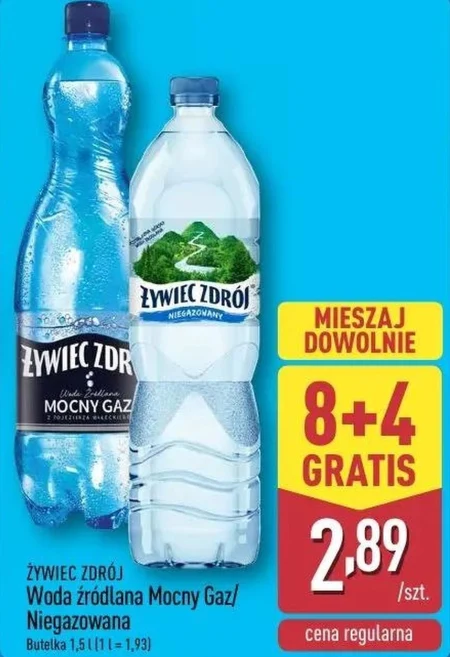 Żywiec Zdrój woda źródlana Mocny Gaz lub Niegazowana dostępna jest w ofercie Aldi w butelce 1,5 l za 2,89 zł, co daje 1,93 zł za litr. W ramach promocji 8+4 otrzymujesz dodatkową butelkę wody gratis, kupując osiem. To idealny sposób na zgromadzenie zapasu świeżej i orzeźwiającej wody źródlanej do codziennego użytku. Promocja ta pozwala zaoszczędzić, a dostęp do wysokiej jakości wody jest zawsze ważny. Oferta ważna od 2026-04-09 do 2026-04-11 Źródło: gazetka Aldi
