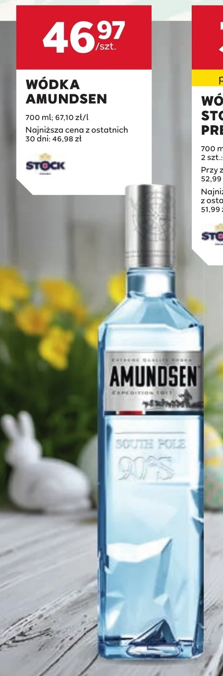 Wódka Amundsen w Stokrotce dostępna jest w cenie 46,97 zł za butelkę o pojemności 700 ml, co daje 67,10 zł za litr. Aktualna cena to najniższa z ostatnich 30 dni, wcześniej produkt kosztował 46,98 zł. Wódkę Amundsen można wykorzystać do przygotowania drinków lub spożywać samodzielnie, korzystając z aktualnej promocji w Stokrotce. Sprawdź gazetkę promocyjną Stokrotka, aby upewnić się, że oferta nadal jest aktualna.
