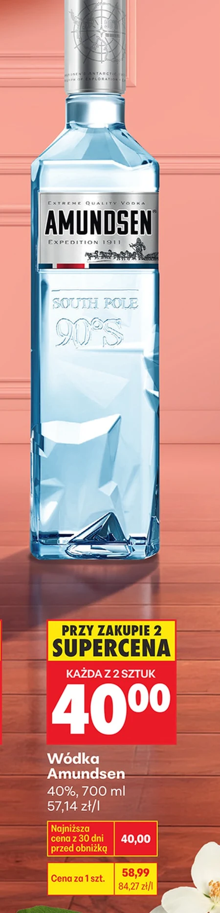 Wódka Amundsen w Biedronce kosztuje obecnie 58,99 zł za butelkę o pojemności 700 ml, co daje 84,27 zł za litr. Promocja pozwala na zakup dwóch butelek w cenie 40,00 zł za sztukę, co jest najniższą ceną z ostatnich 30 dni – wcześniej produkt był dostępny za 40,00 zł. Wódka ma zawartość alkoholu 40%. To okazja, aby zaopatrzyć się w trunek w atrakcyjnej cenie, szczególnie jeśli planujesz większe spotkanie lub uzupełnienie domowego barku. Skorzystaj z tej wyjątkowej oferty i zaoszczędź na zakupie swojej ulubionej wódki.