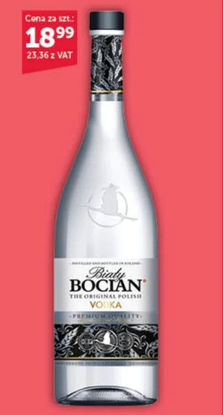 Wódka Biała Bocian, 40%, pojemność 0,5 l. Czysta, cranberry. Cena netto - 18,99 zł.