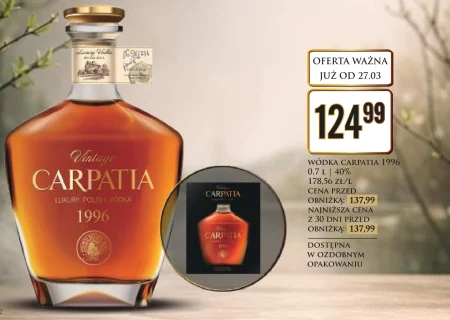 Wódka Carpatia 1996 w ozdobnym opakowaniu jest dostępna w Dino w cenie 124,99 za butelkę 0,7 litra o mocy 40%. Regularna cena tego trunku to 137,99 zł, co oznacza wyjątkową okazję do zakupu. To klasyczna wódka, idealna na specjalne okazje oraz do przygotowania ulubionych drinków. Warto skorzystać z tej oferty już od 27 marca i zaopatrzyć się w wysokiej jakości alkohol w atrakcyjnej cenie.