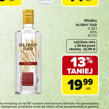 Wódka HLIBNY DAR w butelce o pojemności 0,35 l dostępna jest w ofercie Carrefour Market w cenie 19,99 zł, co oznacza 13% taniej niż najniższa cena z ostatnich 30 dni, która wynosiła 22,99 zł. Produkt ma zawartość alkoholu 40% i oferowany jest w cenie 57,11 zł za litr. Stanowi klasyczny dodatek do uroczystych spotkań lub element przyrządzania drinków. To dobra okazja, aby zaopatrzyć się w ten trunek w korzystnej cenie. Źródło: gazetka Carrefour Market