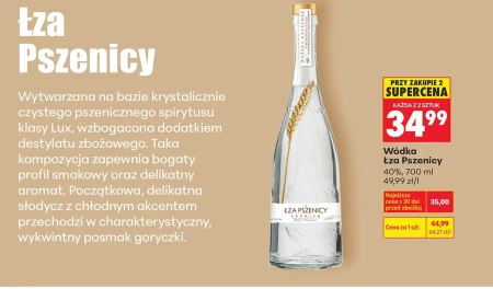 Wódka Łza Pszenicy jest dostępna w ofercie Biedronka w cenie 34,99 zł za dwie butelki, co daje 49,99 zł za litr. Produkt ten wytwarzany jest na bazie pszenicznego spirytusu klasy Lux, wzbogaconego destylatem zbożowym, co zapewnia bogaty smak i delikatny aromat. Charakteryzuje się początkową słodyczą przechodzącą w wykwintny, gorzkawy posmak. To idealny wybór dla osób poszukujących wódki o złożonym profilu smakowym w atrakcyjnej cenie. Najniższa cena z ostatnich 30 dni wynosiła 35,00 zł, a cena za jedną butelkę wynosi obecnie 44,99 zł. Oferta ważna od 2026-04-07 do 2026-04-18 Źródło: gazetka Biedronka