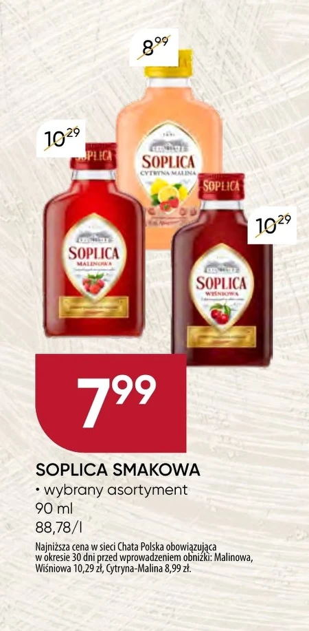SOPLICA SMAKOWA · wybrany asortyment 90 ml 88,78/l Najniższa cena w sieci Chata Polska obowiązująca w okresie 30 dni przed wprowadzeniem obniżki: Malinowa, Wiśniowa 10,29 zł, Cytryna-Malina 8,99 zł.