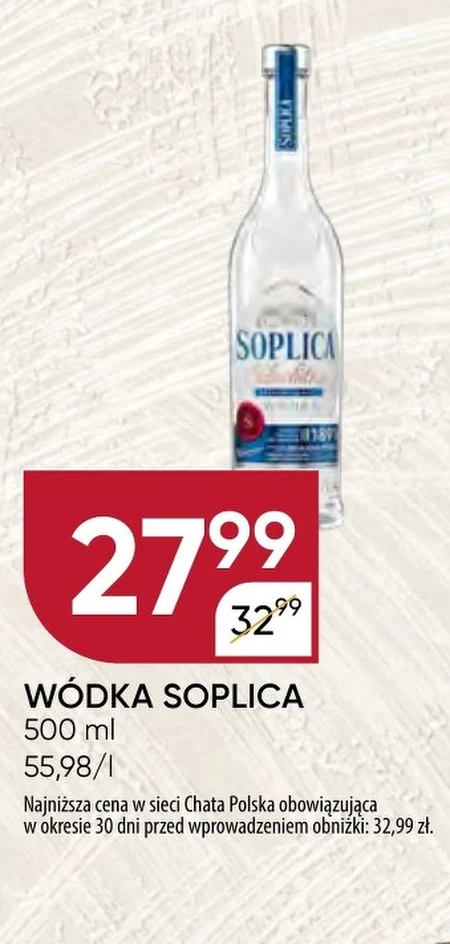 WÓDKA SOPLICA 500 ml 55,98/l Najniższa cena w sieci Chata Polska obowiązująca w okresie 30 dni przed wprowadzeniem obniżki: 32,99 zł.