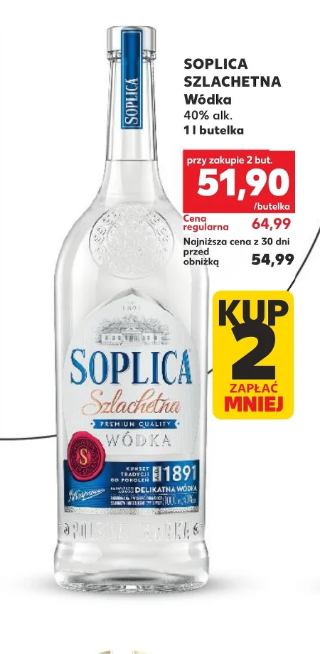 SOPLICA SZLACHETNA Wódka 40% alk. 1 l butelka przy zakupie 2 but. 51,90 /butelka Cena regularna 64,99 Najniższa cena z 30 dni przed obniżką 54,99 SOPLICA Szlachetna to klasyczna wódka o mocy 40%, dostępna w butelkach litrowych. Produkt ten można znaleźć w ofercie Kauflandu, co daje wygodę zakupu w znanym i dostępnym markecie. Wódka SOPLICA Szlachetna doskonale sprawdzi się zarówno jako element drinków, jak i tradycyjnie, serwowana schłodzona. Przy zakupie dwóch butelek cena jednostkowa obniża się.