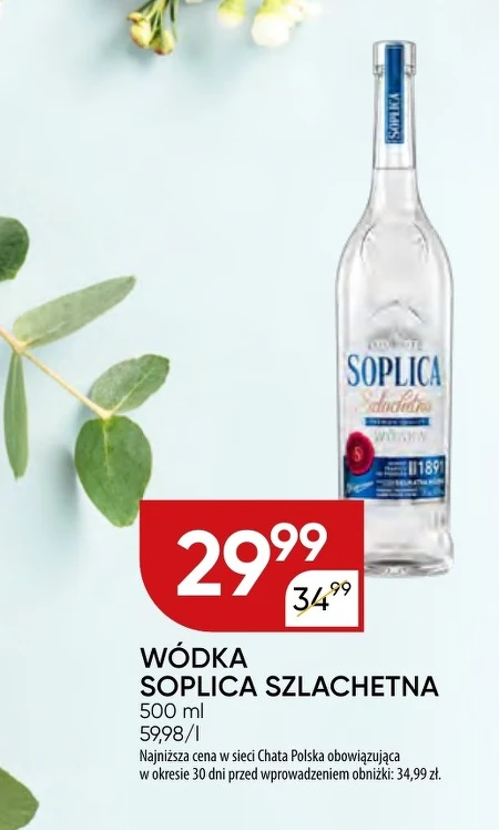 Wódka Soplica Szlachetna dostępna jest w ofercie Chata Polska w cenie 29,99 zł za butelkę 500 ml, co daje 59,98 zł za litr. Najniższa cena w sieci Chata Polska w ciągu ostatnich 30 dni wynosiła 34,99 zł. To klasyczna wódka, idealna do degustacji w czystej formie lub jako baza do ulubionych drinków, ceniona za swoją tradycyjną recepturę. Skorzystaj z obniżki i zaopatrz się w sprawdzony alkohol, zanim cena wróci do poprzedniej wartości.