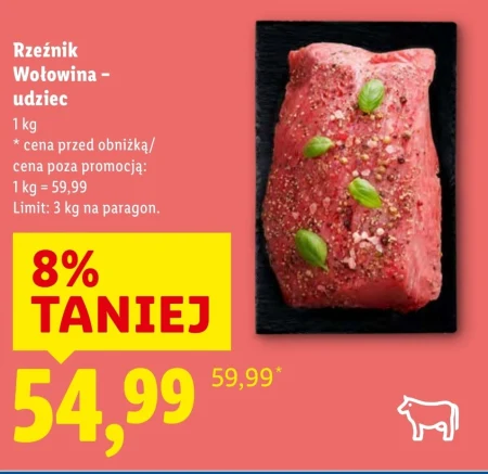Rzeźnik Wołowina - udziec 1 kg * cena przed obniżką/ cena poza promocją: 1 kg = 59,99 Limit: 3 kg na paragon.