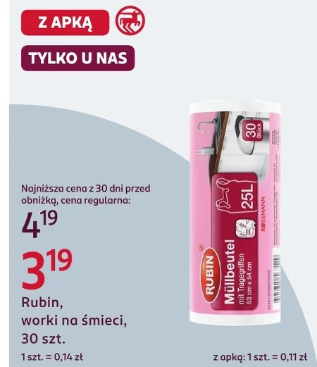 Worki na śmieci Rubin, 30 sztuk, dostępne są w ofercie Rossmann w cenie 3,19 zł. Najniższa cena z ostatnich 30 dni wynosiła 4,19 zł. Pojemność worków to 25 litrów, a ich wymiary to 53 cm x 54 cm. Worki posiadają wygodne uchwyty, co ułatwia ich użycie i transport. Sprawdzą się do segregacji odpadów w każdym domu, a także w biurze czy ogrodzie. To świetna okazja, aby zaopatrzyć się w niezbędne akcesoria do utrzymania czystości w domu w atrakcyjnej cenie.