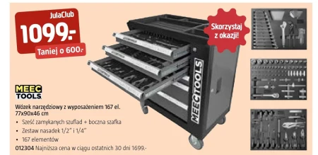 Wózek narzędziowy z wyposażeniem 167 el. marki MEEC TOOLS kupisz w Jula w cenie 1099,-, co stanowi obniżkę o 600,- w porównaniu do najniższej ceny z ostatnich 30 dni. Ten solidny wózek o wymiarach 77x90x46 cm to idealne rozwiązanie dla każdego majsterkowicza i profesjonalisty potrzebującego uporządkowanego miejsca na narzędzia. Posiada sześć zamykanych szuflad oraz praktyczną boczną szafkę, a w zestawie znajdziesz bogaty wybór nasadek 1/2" i 1/4", składający się łącznie ze 167 elementów. To doskonała okazja, aby zaopatrzyć się w kompletny zestaw narzędzi w atrakcyjnej cenie. Oferta ważna od 2026-04-09 do 2026-04-22 Źródło: gazetka Jula