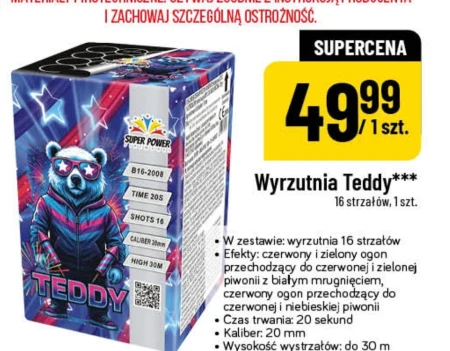 Wyrzutnia Teddy* 16 strzałów, 1 szt. · W zestawie: wyrzutnia 16 strzałów · Efekty: czerwony i zielony ogon przechodzący do czerwonej i zielonej piwonii z białym mrugnięciem, czerwony ogon przechodzący do czerwonej i niebieskiej piwonii · Czas trwania: 20 sekund · Kaliber: 20 mm · Wysokość wystrzałów: do 30 m