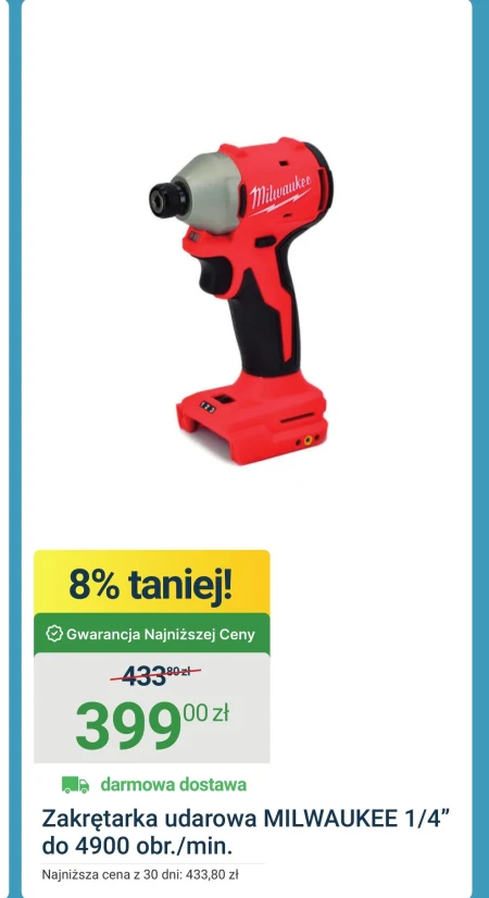 Zakrętarka udarowa 1/4" występuje w ofercie ERLI w cenie 399,00 zł, obniżonej o 8% z 433,80 zł. To narzędzie osiąga prędkość do 4900 obrotów na minutę i jest idealne do prac wymagających wysokiego momentu obrotowego, takich jak skręcanie i odkręcanie śrub oraz wkrętów. Zakrętarka udarowa sprawdzi się zarówno w warsztacie, jak i podczas prac remontowych czy montażowych. Teraz możesz nabyć to urządzenie z darmową dostawą i mieć pewność, że korzystasz z najniższej ceny w ostatnich 30 dni. Oferta ważna od 2026-04-06 do 2026-04-12 Źródło: gazetka ERLI